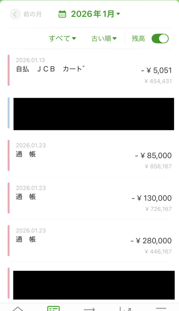 先月末と今月末の預金残高を比べると、1,485,184円から1,454,693円に下がりました。ボーナスのおかげですね。