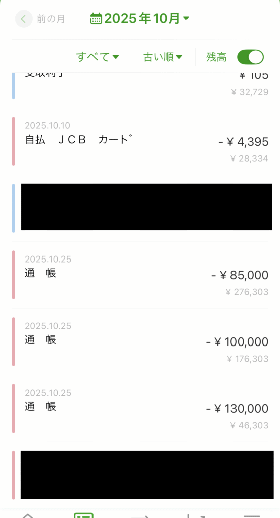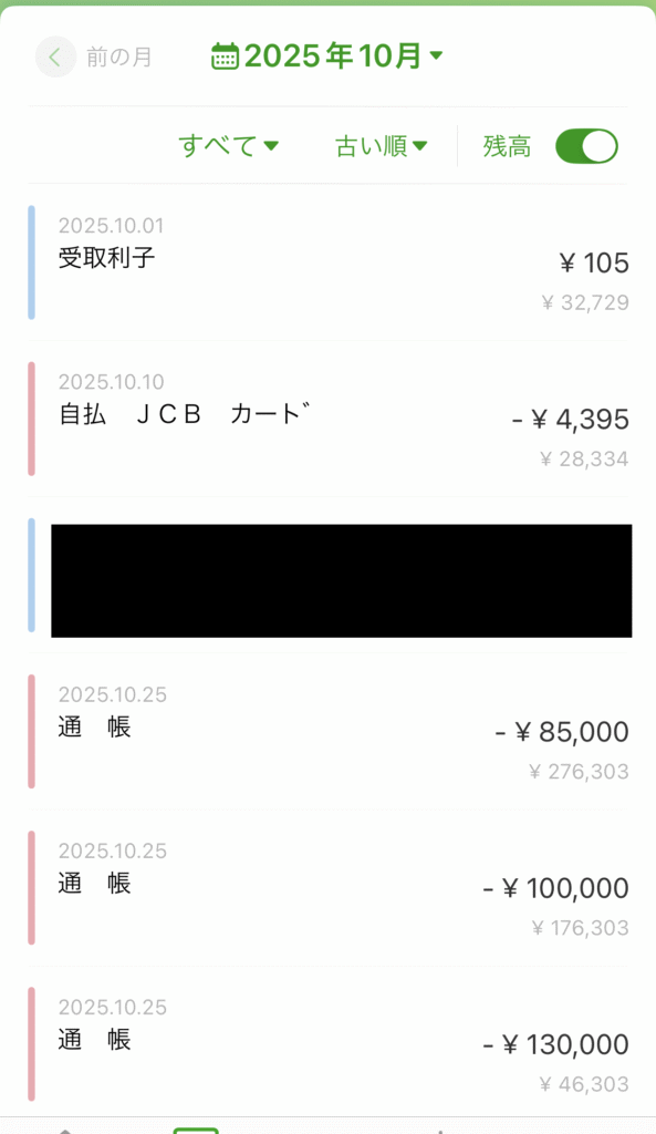 先月末と今月末の預金残高を比べると、1,043,626円から1,033,129円に下がりました。残念。
