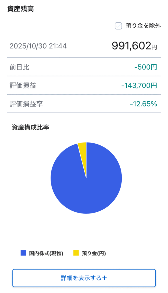 7,934円の黒字です。株は、1,011,002円から991,602円で19,400円で赤字です。